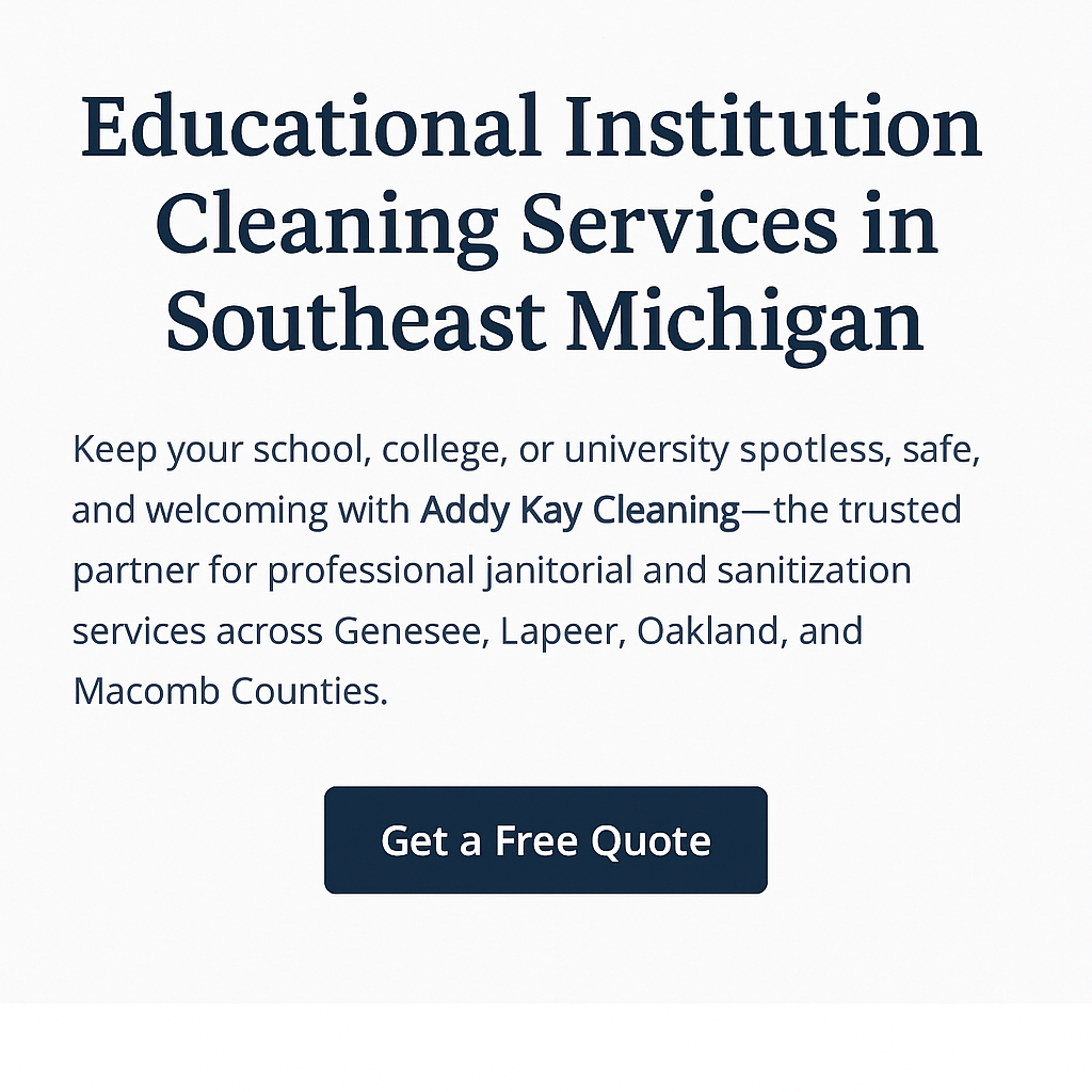 Keep your school, college, or university spotless, safe, and welcoming with Addy Kay Cleaning — the trusted partner for professional janitorial and sanitization services across Genesee, Lapeer, Oakland, and Macomb Counties.